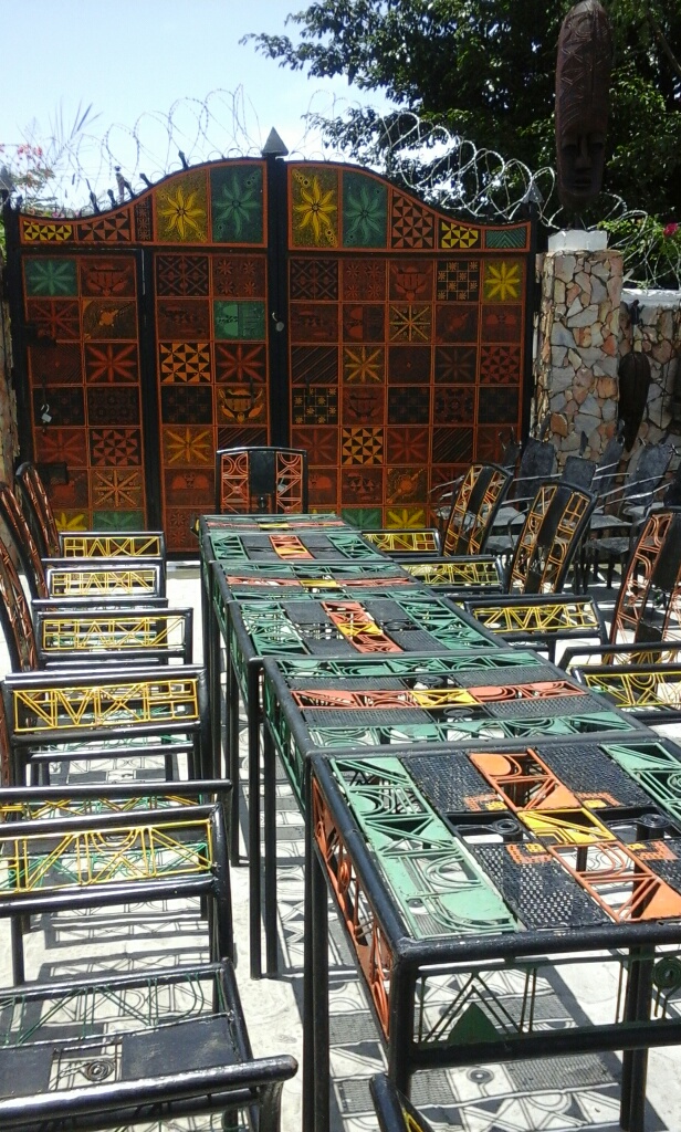 When inside the courtyard, your eyes are drawn to the beautiful iron bulls that look like the guardians of the premisses and by the colorful chairs and tables in display: